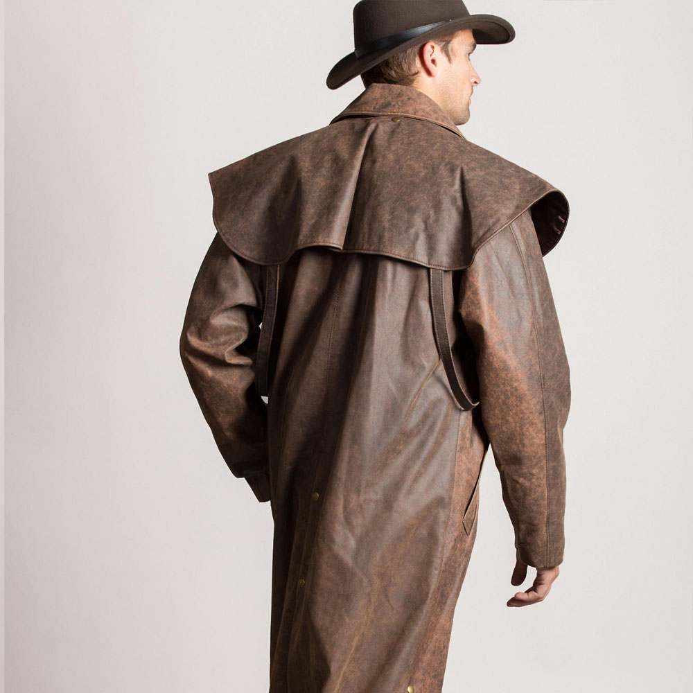 Crafted from premium distressed leather in rich tobacco brown, this leather duster coat men’s features distinctive weathered texture that tells stories before you even speak. The iconic cape-shoulder design—a hallmark of authentic Old West styling—provides exceptional freedom of movement while creating an imposing silhouette. The dramatic floor-length cut sweeps as you walk, delivering cinematic flair with every step.