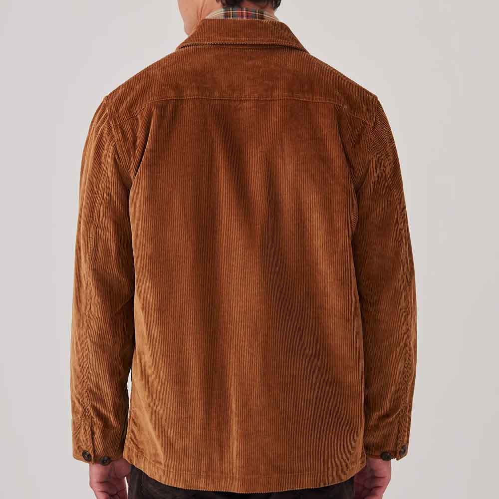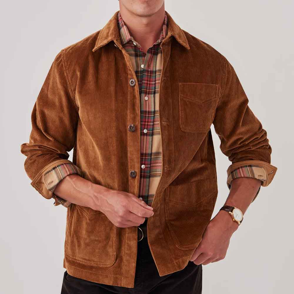 This brown cord jacket excels as a layering piece throughout autumn and spring. Wear it open over plain tees and jeans for weekend casual vibes, button it up with chinos for smart-casual occasions, or layer it under heavier coats during colder months for added insulation. The warm brown tone complements various color palettes, from earth tones to denim blues.