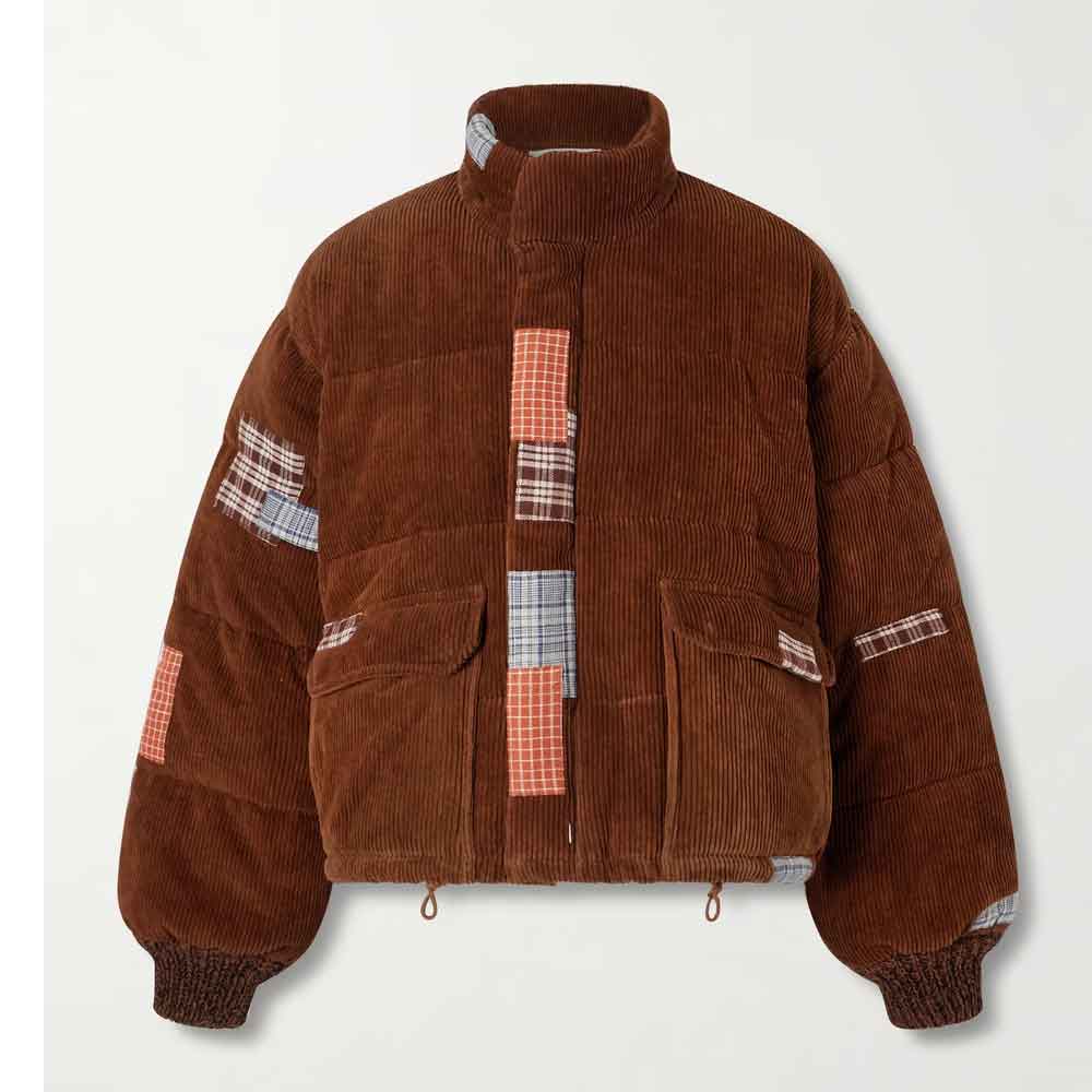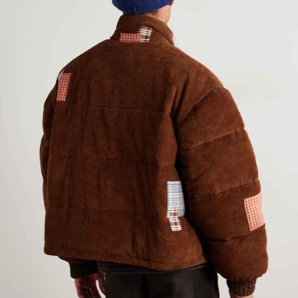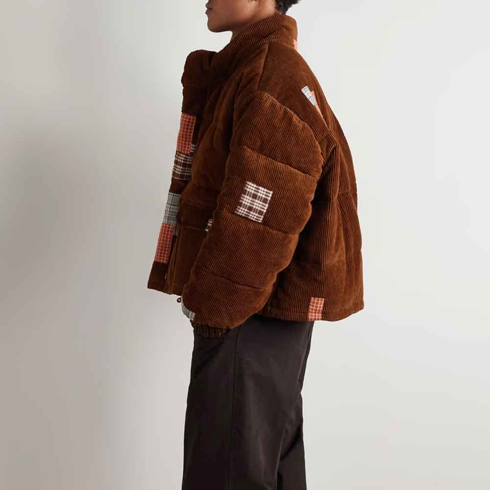 Crafted from rich brown corduroy with quilted construction, this bubble style corduroy jacket features colorful plaid patchwork details strategically placed across the sleeves, chest, and pockets. The orange, brown, and grey plaid patches create striking visual contrast against the chocolate brown base, transforming ordinary outerwear into wearable art. The oversized puffer silhouette with ribbed cuffs and high collar delivers exceptional warmth while making a confident fashion statement.