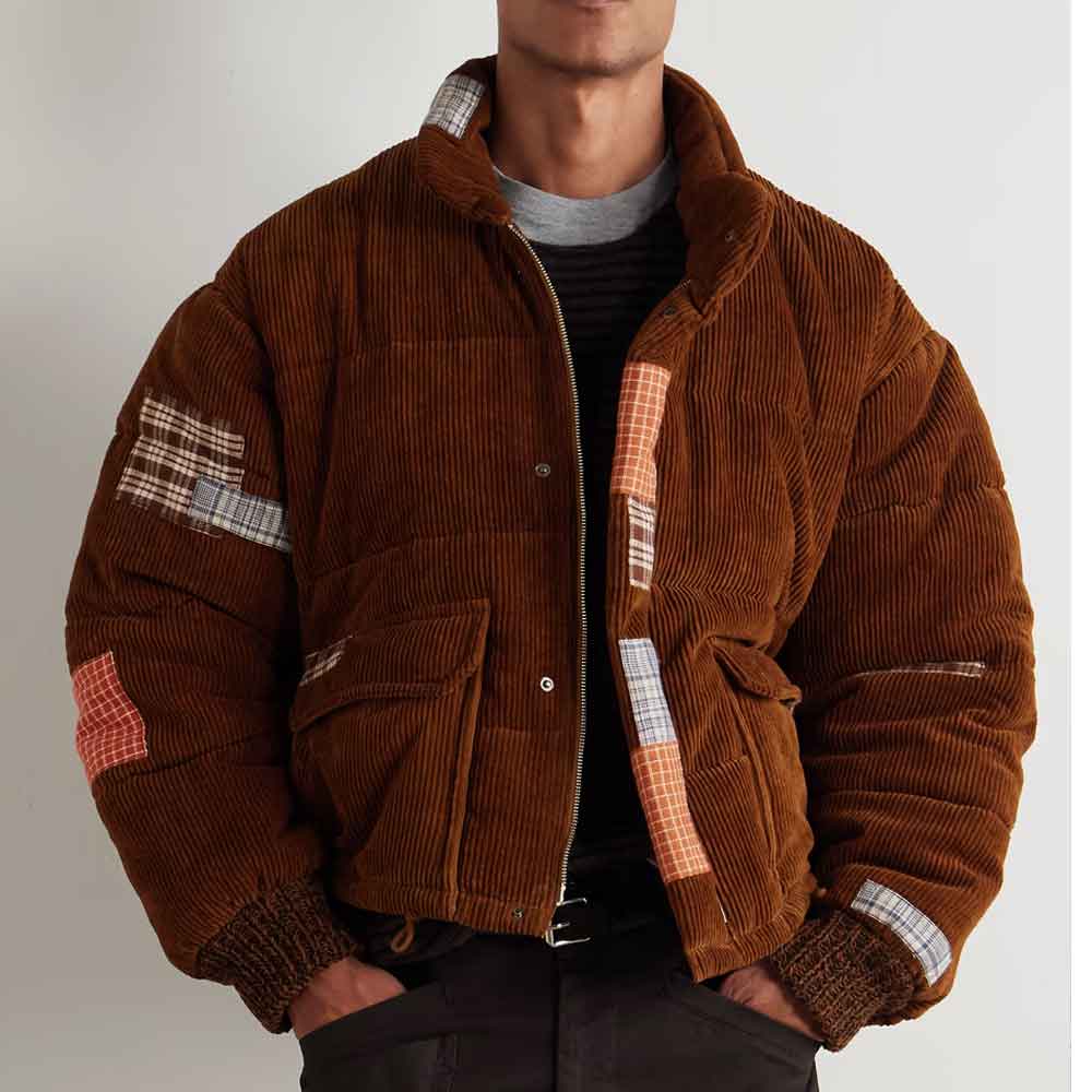 The Patchwork Corduroy Jacket from Rustic Hide makes an audacious style statement with its distinctive bubble silhouette and eye-catching patchwork details. This innovative brown patchwork corduroy jacket reimagines traditional outerwear by combining vintage corduroy texture with contemporary puffer styling and artistic patchwork accents, creating a truly one-of-a-kind piece for fashion-forward individuals.