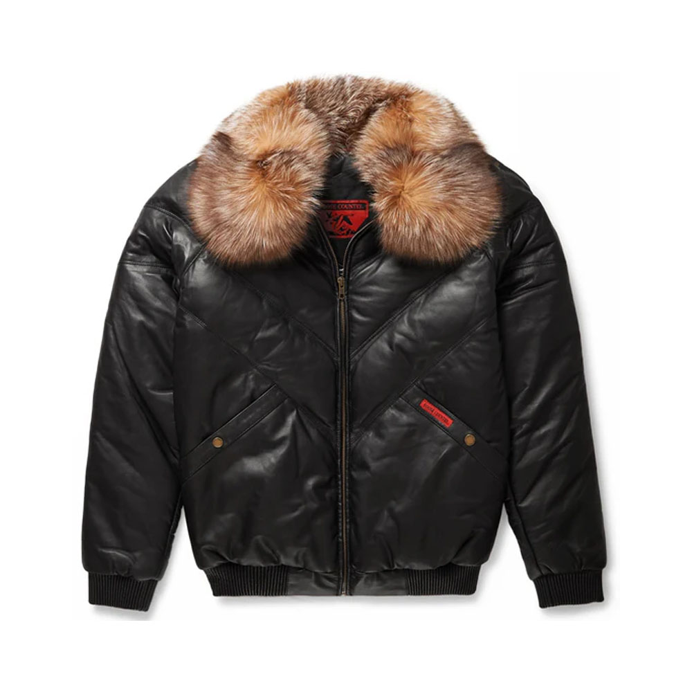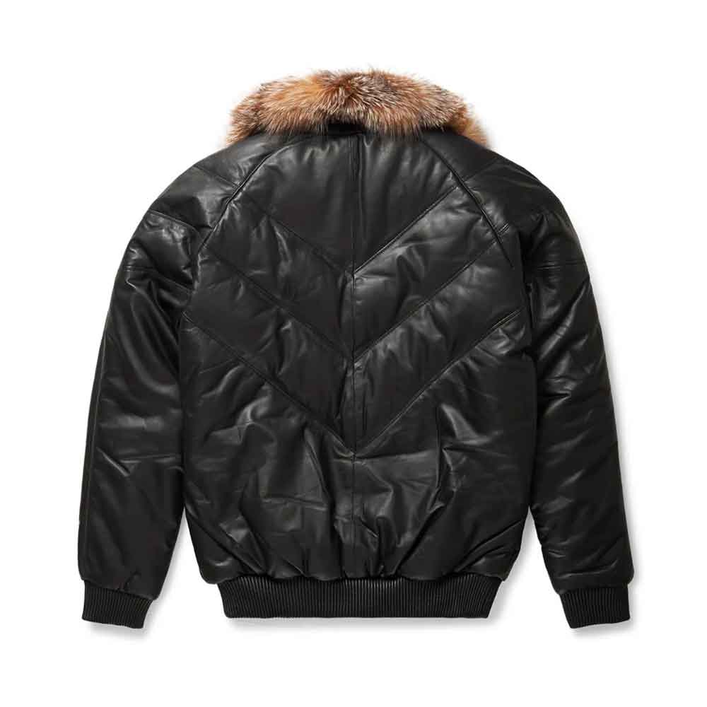 V Bomber Leather Jacket in Black With Genuine Fox Fur